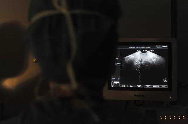 曹文丽在B超引导下吸出卵泡液,卵泡液被迅速转移到培养皿中,并通过专用通道送入实验室。