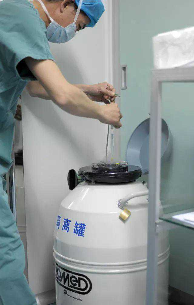 胚胎装杆后迅速放入液氮中,并做相应的处置,最后将载杆放入液氮罐中对应的位置保存。将多余的胚胎冷冻起来,假使第一次胚胎移植失败,冷冻的胚胎还可以解冻、复苏,做第二次移植。胚胎冷冻技术让“睡美人”不再是童话故事。