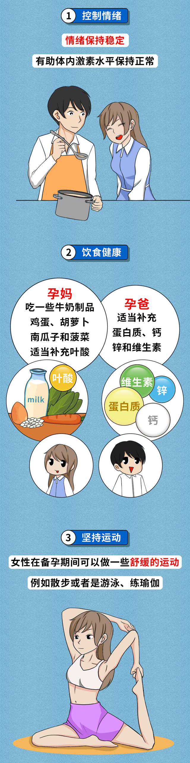 孕期补充叶酸能够避免胎儿产生畸形,神经器官缺陷。除了叶酸,备孕期还要多补充比如铁剂,对于预防孕妇贫血是非常有帮助的。还有维生素E、维生素B6、维生素B12等等都可以帮助预防出生缺陷。适当地补充维生素B6可以帮助缓解孕吐轻度的孕吐。此外,根据国家的孕期指南来讲,孕妇三个月后可进行钙质和维生素D的补充,可以预防孕妇骨质疏松和抽筋,还可以促进胎儿的骨骼生长发育。很多准妈妈在备孕期间有一个误区,认为我只需要在备孕期间补充维生素就行了。但其实随着怀孕期间宝宝的发育需求日渐增长,妈妈也需要增加对维生素的摄入,最好能坚持到哺乳期结束。