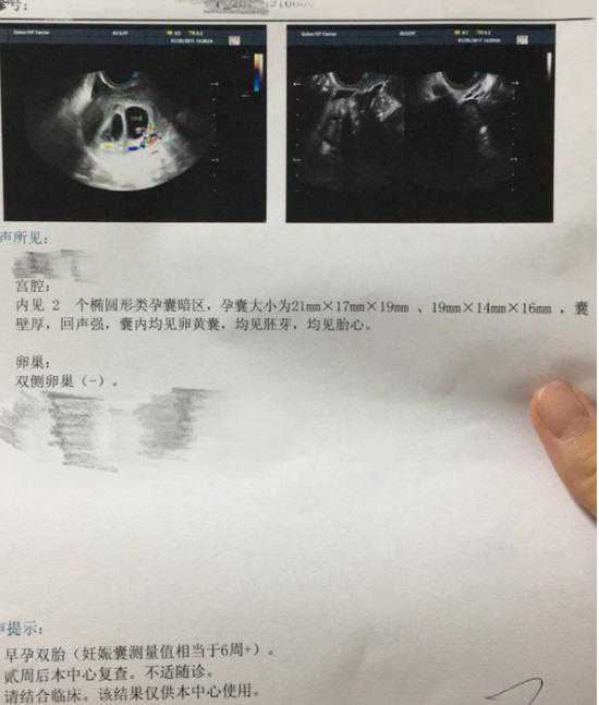 之后移植了冻胚2枚,移植后第9天验出粉印。第14天后去医院验血HCG呈阳性。随后一超显示双胎见胎芽、有胎心。