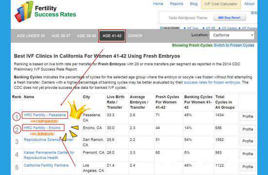 美国最新公布数据显示:在全美各大试管婴儿医院里,美国HRC医疗集团在大龄女性年龄组(41-42岁)稳摘全美国试管婴儿医院成功率第一桂冠!