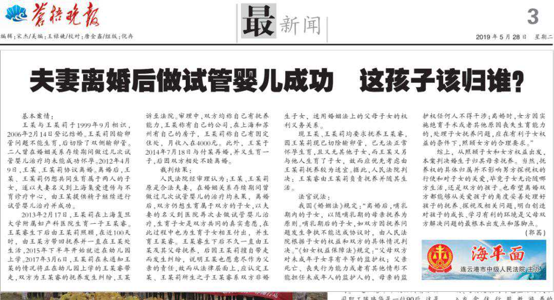 人民法院经审理认为:王某、王某莉原是合法夫妻,在婚姻关系存续期间曾做过几次试管婴儿的治疗均未果,离婚后,双方仍想生育属于双方的子女,以夫妻的名义到医院再次去做试管婴儿治疗,生育子女是双方共同的真实意愿,在此过程中也为生育子女相互的付出,并生育王某睿。王某睿生下后不久一直由王某及其父母抚养,后因王某莉擅自带走而发生纠纷,说明王某也愿意尽作为父亲的责任,故而从法律层面上,应认定王某、王某莉所生之子王某睿系双方非婚生子女,适用婚姻法上的父母子女的权利义务关系。